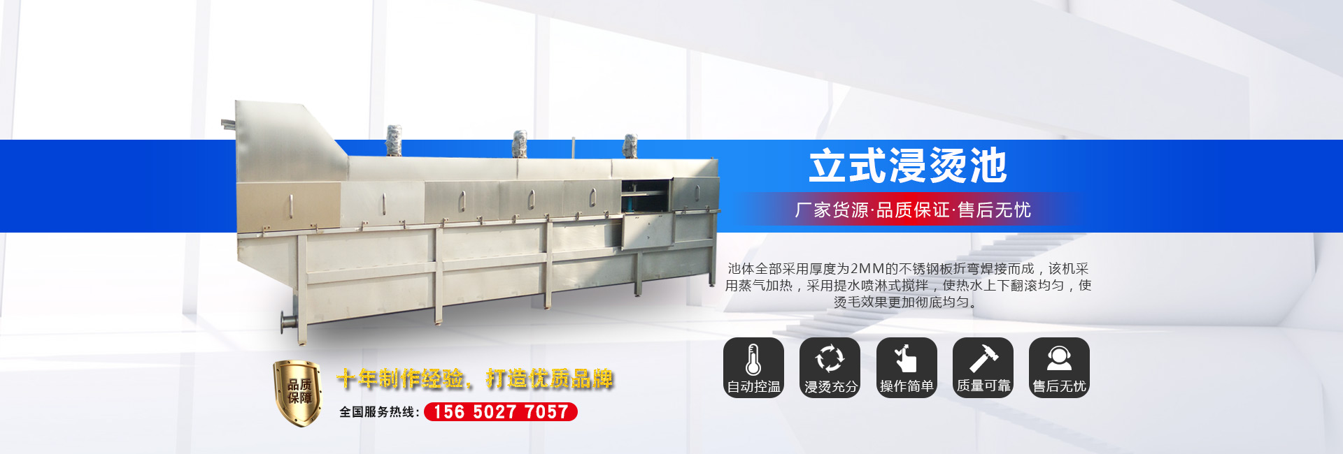 公司長期與國內外屠宰加工企業合作,走引進——消化——創新和自主研發相結合的道路,在國內外同類產品的基礎上,不斷更新和改造。公司主要設備有:A字型立式脫毛機、臥式脫毛機、強力噴淋機、松毛機、浸燙池、螺旋預冷機、禽籠清洗機、電暈機、兔扯皮機、兔割前爪/后爪機、剝胗機、自動洗鉤機、螺旋燙爪機、雞爪脫皮機、分割輸送帶等屠宰用設備。其中,公司獨力發明生產設計的“電動調節脫毛機”及“自動控水控溫浸燙池”順利通過知識產權局的實質性審查。公司所生產的設備 可與國外同類產品配套使用,設備遠銷阿爾及利亞、澳大利亞等中東、非州等并建立了長期穩定的合作關系。